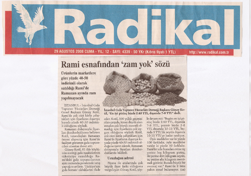 İstanbul Gıda Toptancı Tüccarları Derneği Genel Başkanı Günay Kotil, Rami’de çok cüzi kârla çalıştıkları için fiyatların dışarıya kıyasla yüzde 40-50 indirimli olduğunu söyledi.